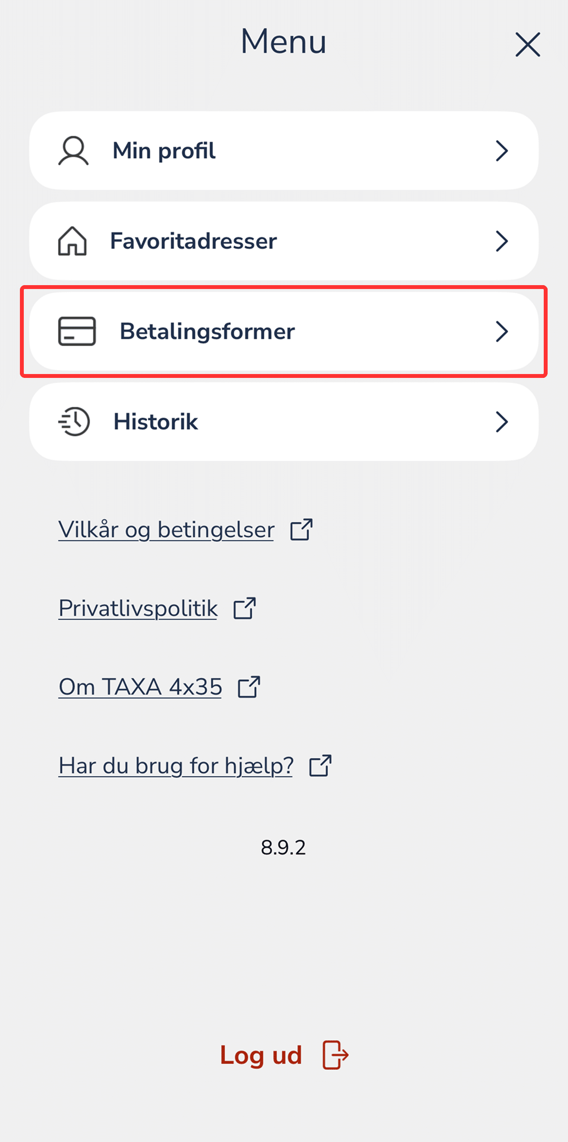 Klik på menuikonet i øverste venstre hjørne og vælg menupunktet “Betalingsformer”.